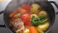 - 具材に火が通ったら水を加える。