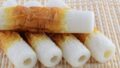 6. 片栗粉(適量)を直接フライパンに入れ、片栗粉の上に肉巻きをのせる。フライパンをふって肉巻き全体に片栗粉をまぶす。